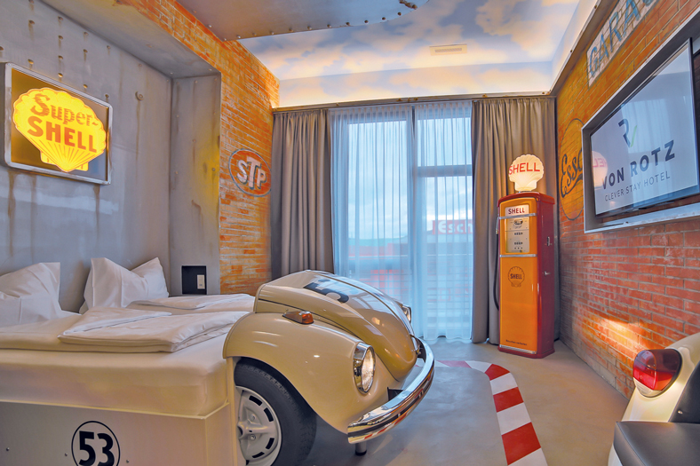 Neben den Business-Zimmern mit ihren geräumigen Arbeitsplätzen bietet das Hotel noch einige weitere Extras, die es so in der Ostschweiz nicht gibt. Der Hubschrauber-Landeplatz auf dem Dach ermöglicht ganz spezielle Ausflüge oder auch einen direkten Taxiservice vom und zum Flughafen. Die Themenzimmer für Autoliebhaber bieten ein exquisites Ambiente: Da schläft man im sportlichen Jaguar oder ganz rustikal in der Scheune oder im Waschanlagen-Design und vieles mehr.